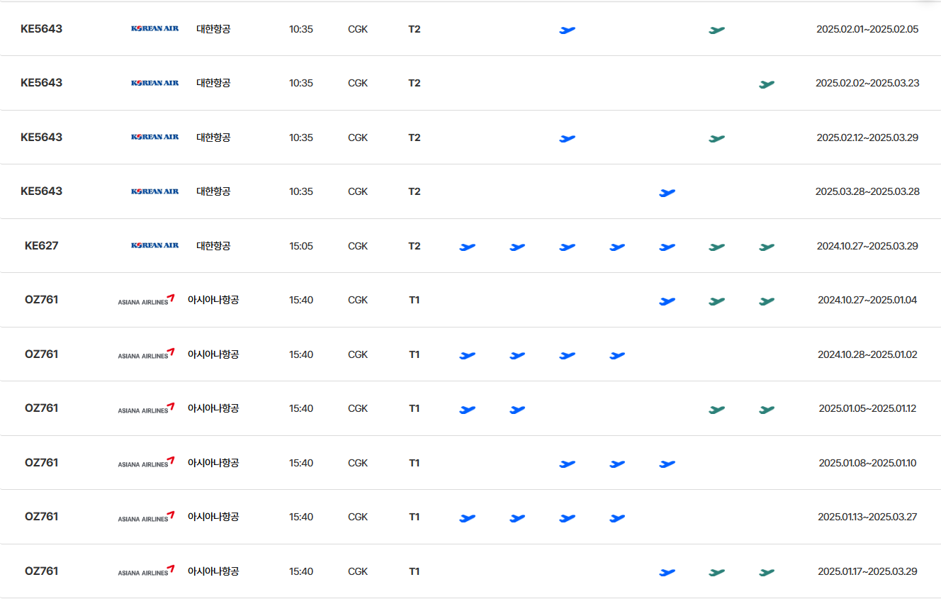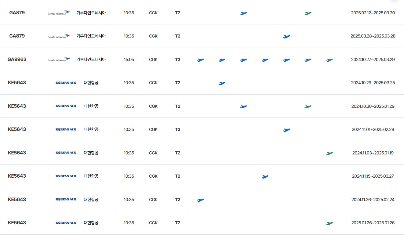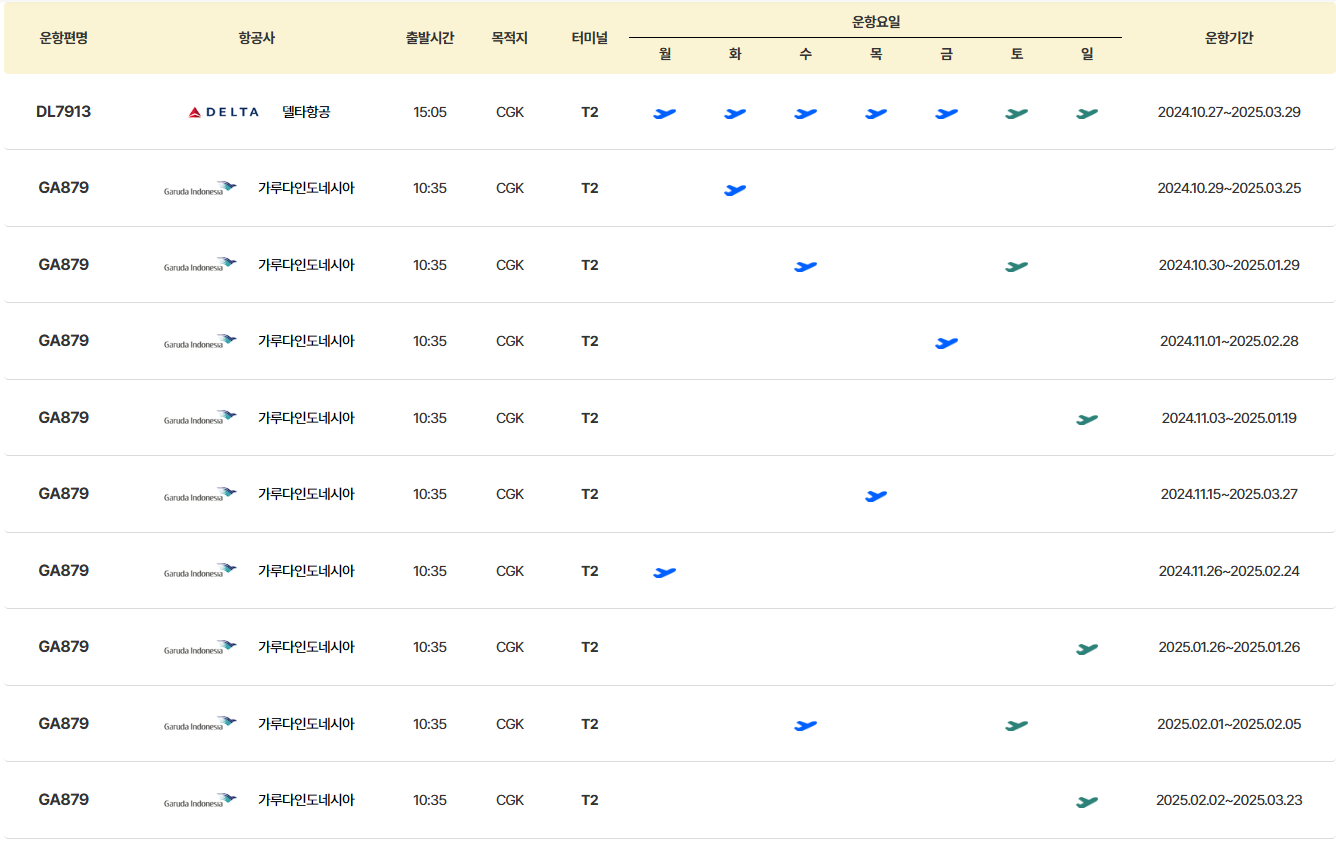 인천공항에서 자카르타공항까지 가는 비행기 시간표는 아래의 스케줄을 참고하시기를 바랍니다.